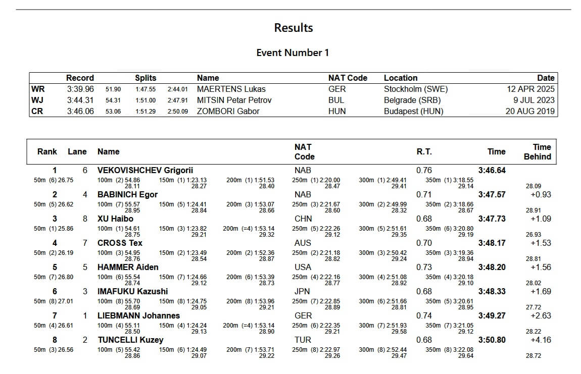 Vekovishchev era il primo ad ogni muro da 150 in poi. Babinich corse terzo fino a quando non si scatenò nel quinto 50. Andò 3: 47.57, trattenendo di 0,16 secondi l’accusa di China Xu Haibo, che ha avuto il bronzo. Nuoto dalla corsia 8, Xu era sesto a 350 metri prima di tornare nel 26,93.
