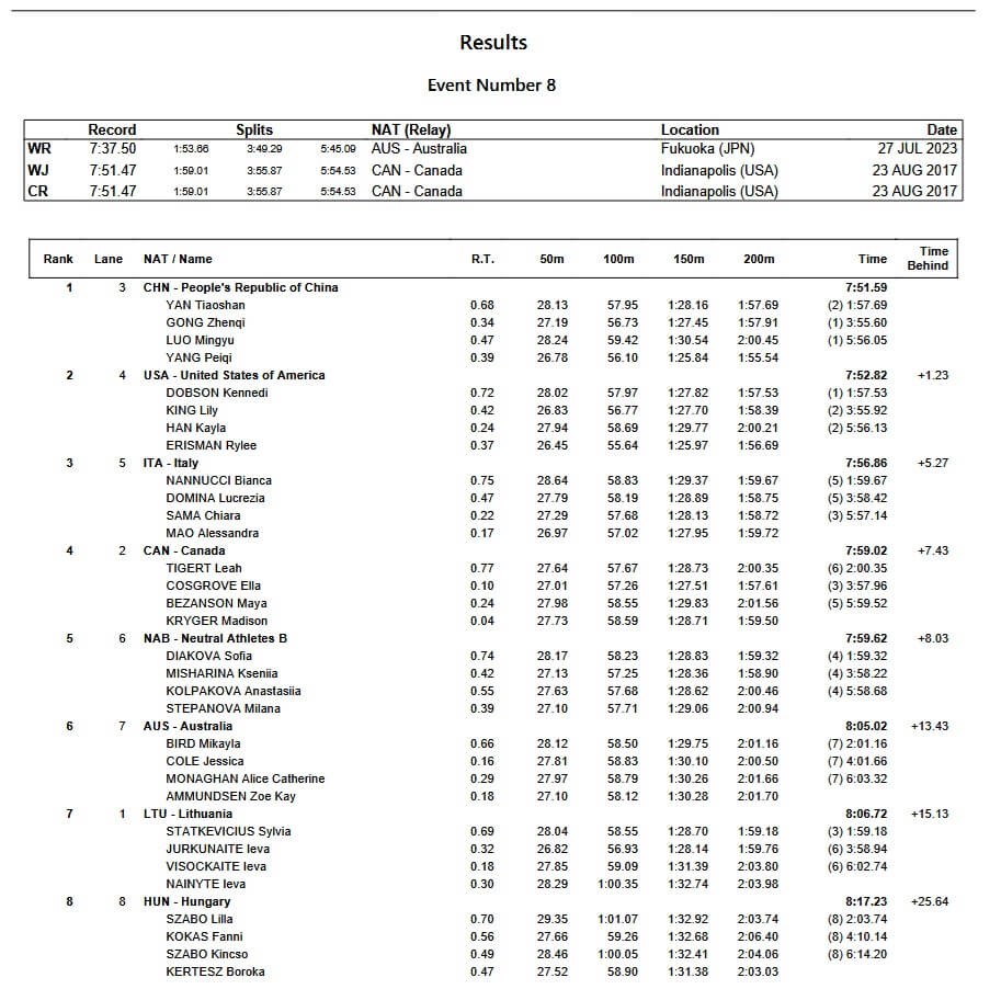 La Cina ha vinto la gara in 7: 51.59, a soli .12 dal record di incontro e junior mondiale stabilito nel 2017 dal Canada. Gli Stati Uniti non potevano tenere il passo, in secondo luogo per la maggior parte della strada per l’argento in 7: 52.82.