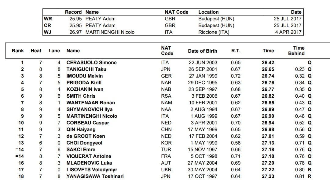 Tedesco Melvin Imoudu afferrò il terzo seme in 26.64, seguito da Kirill Prigoda (26.76), Ivan Kozhakin (26.77), Sudafrica Chris Smith (26.82), Ronan wannaar (26.75) e Ilya Shymanovichche ha completato i primi otto.