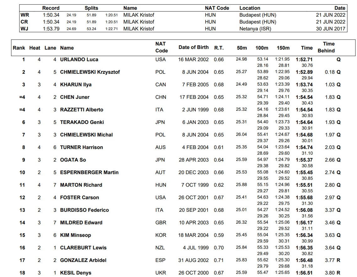 Polonia Krzysztof Chmielewski era l’altro nuotatore sul campo per rompere 1:53, andando a 1: 52.89 per portare il secondo seme in semifinale.