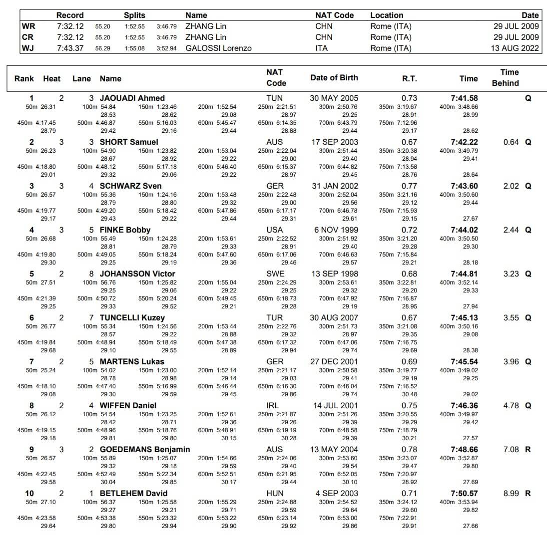 Svezia Victor Johansson (7: 44.81), Turchia Kuzey Tuncelli (7: 45.13), Germania Lukas Martens (7: 45.54) e l’Irlanda Daniel Wiffen (7: 46.36) ha completato i finalisti.