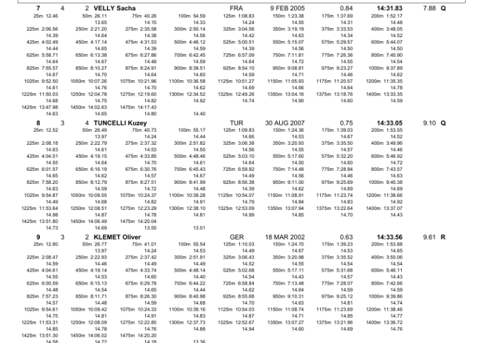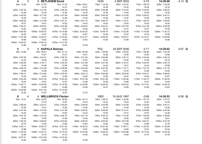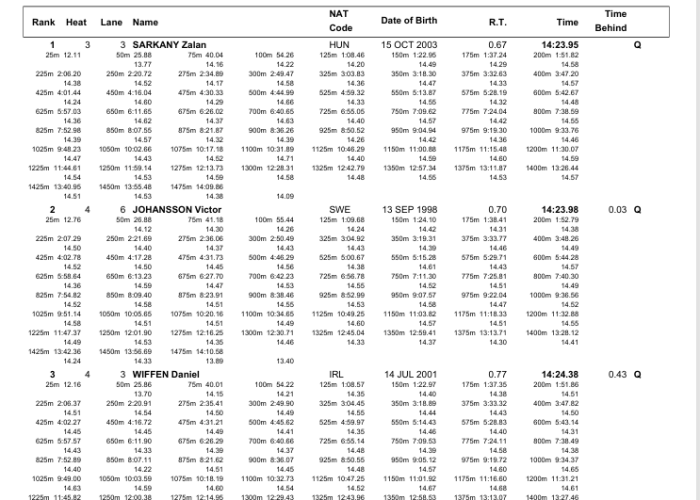 Zalan Sarkany ha registrato 14:23.95 nella penultima manche prima che la manche finale vedesse Wiffen e Wellbrock uno accanto all’altro. L’irlandese ha superato gli 800 in 7:38 con il campione in carica in testa fino agli ultimi 25 quando Victor Johansson lo ha superato per postare da 14:23.98 a 14:24.38. Tuncelli sguscia all’ottavo posto (14:33.05) ma non c’è posto per Oliver Klemet (14:33.56) o Damiano Joly (14:33.98).