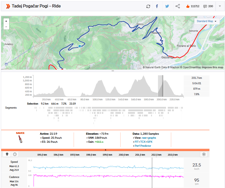 La salita del Passo di Ganda è la migliore prestazione di Pogačar in 20 minuti w/kg della stagione. Ci sono state alcune prestazioni paragonabili al Tour de France, come le sue salite dell’Hautacam e il Mont Ventoux, ma quelle salite erano significativamente più lunghe, 35-55 minuti.