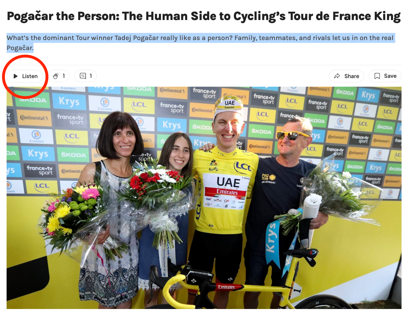 Se sei come noi, hai una dozzina di storie aperte in schede che giuri che leggerai più tardi, subito dopo aver finito il lavoro, preparato la cena e registrato il tuo lungo allenamento. Ora, grazie a una nuova funzionalità su Al di fuori titoli compresi Veloi contenuti sono molto più facili da fruire in movimento.